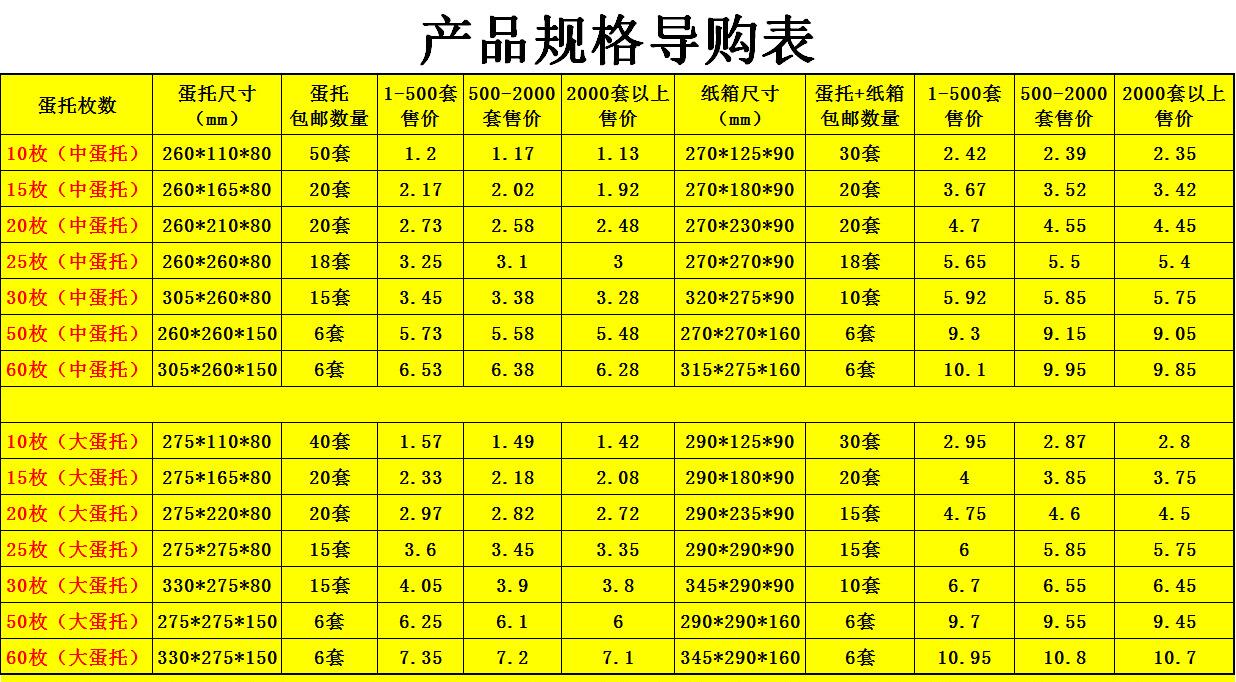 珍珠棉蛋托可以生產(chǎn)加工成什么類型的呢?要滿足雞蛋的長(zhǎng)途運(yùn)輸,對(duì)珍珠棉蛋托的生產(chǎn)要求也是挺高的。下面一組數(shù)據(jù)是我廠為各養(yǎng)雞、養(yǎng)鴨廠制定的大小尺寸。
